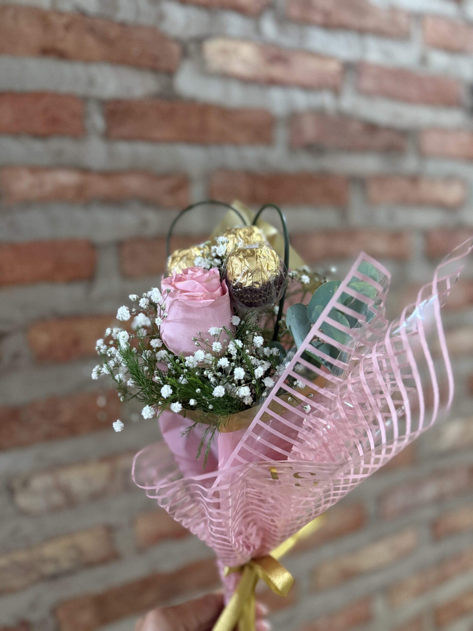 Botão de rosa com 3 unidades de ferrero rocher, folhagens e gipsófila.