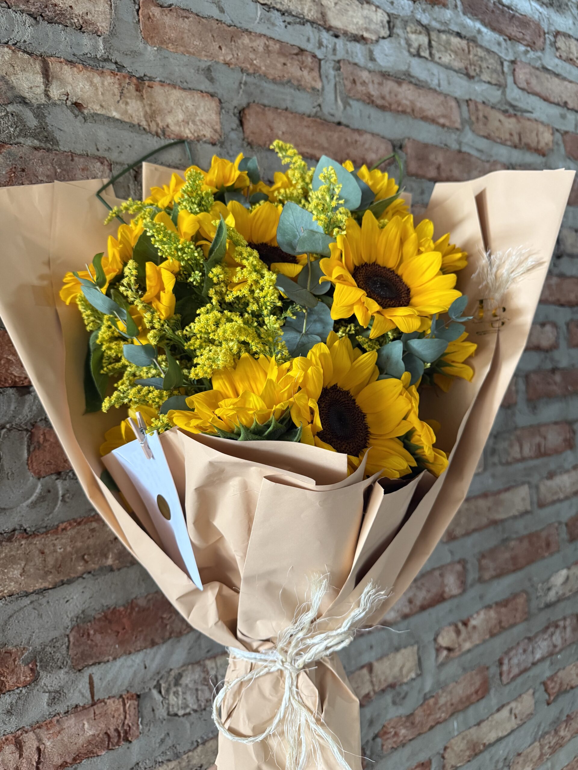 Lindo buquê rústico com 12 girassóis, folhagens e tango.