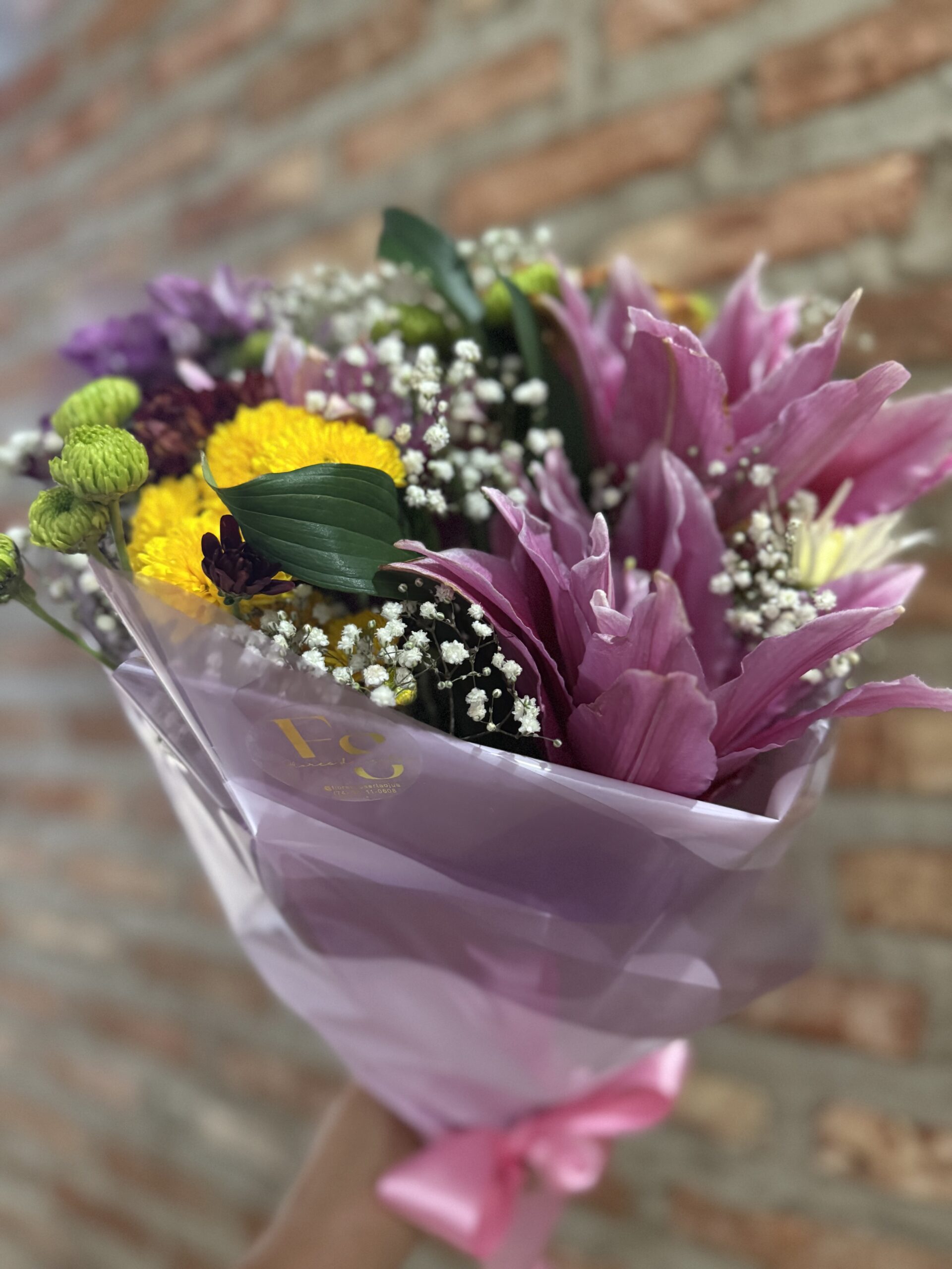 Buquê de 2 galhos de lirios com flores do campo, folhagens e gipsófila.