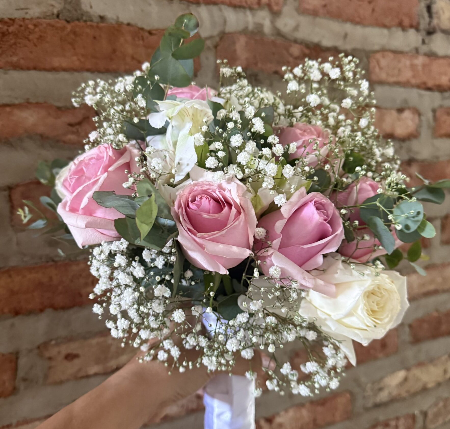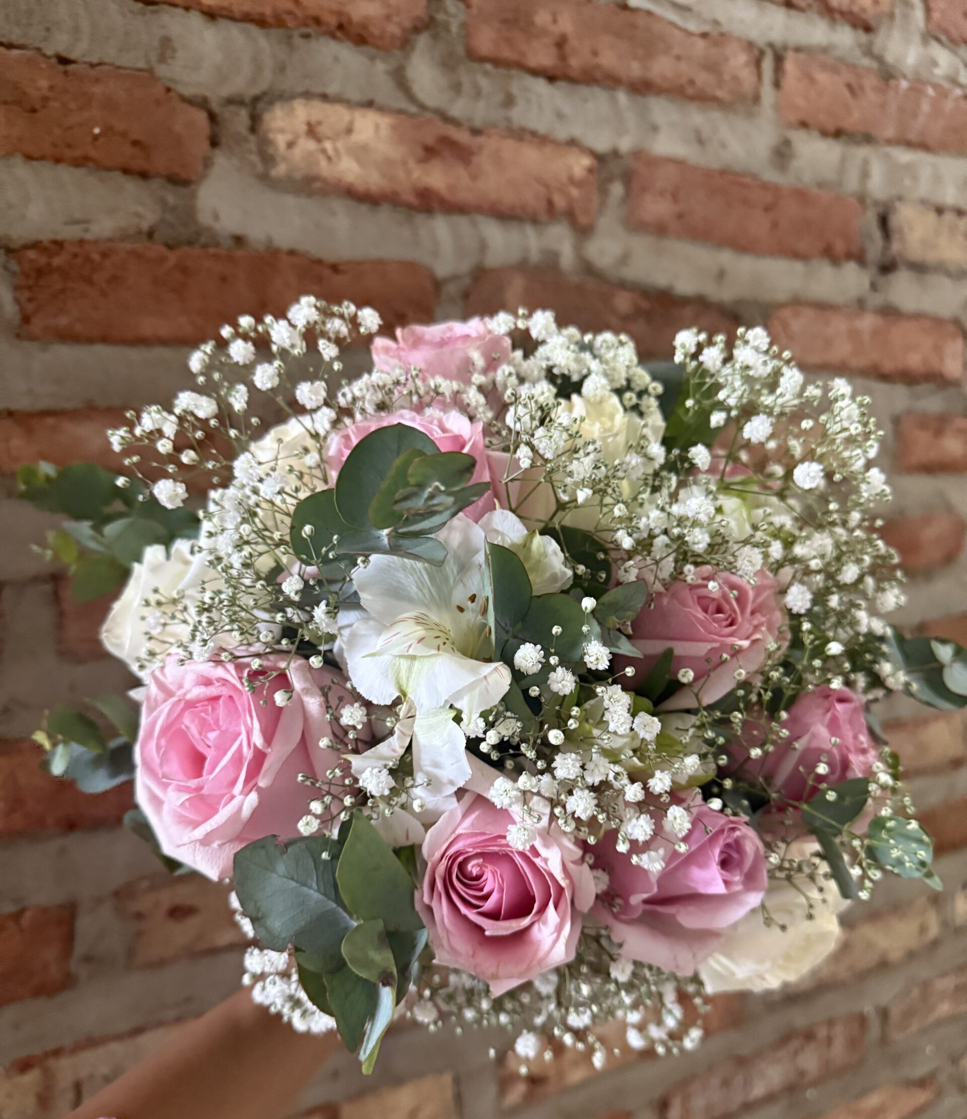 Buquê de noiva com 4 rosas brancas, 4 rosas cor de rosa e astromélias brancas, folhagens, eucalipto e gipsófila.