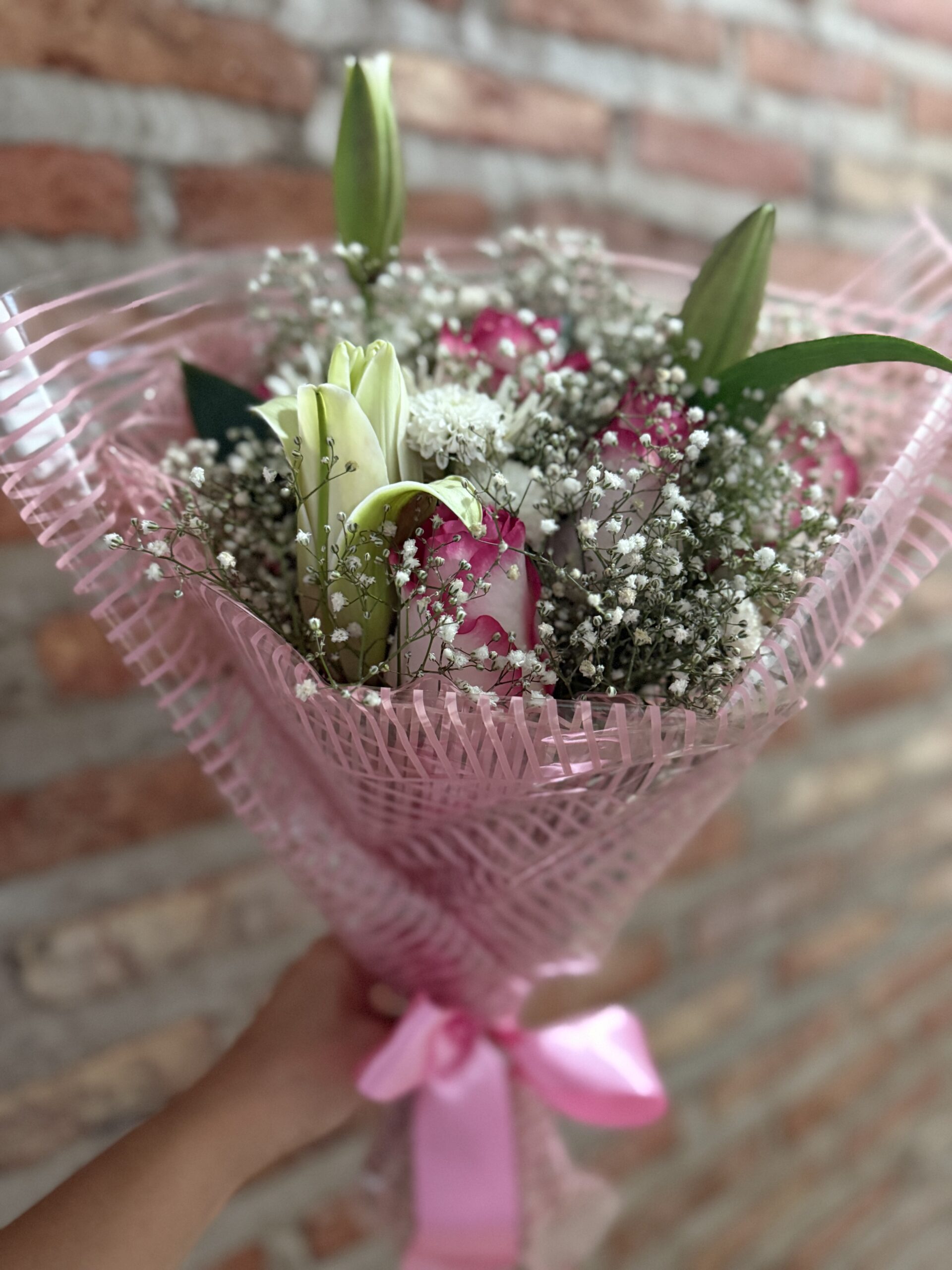 Buquê com 6 rosas cor de rosa, 1 galho de lírio, folhagens e gipsófila.