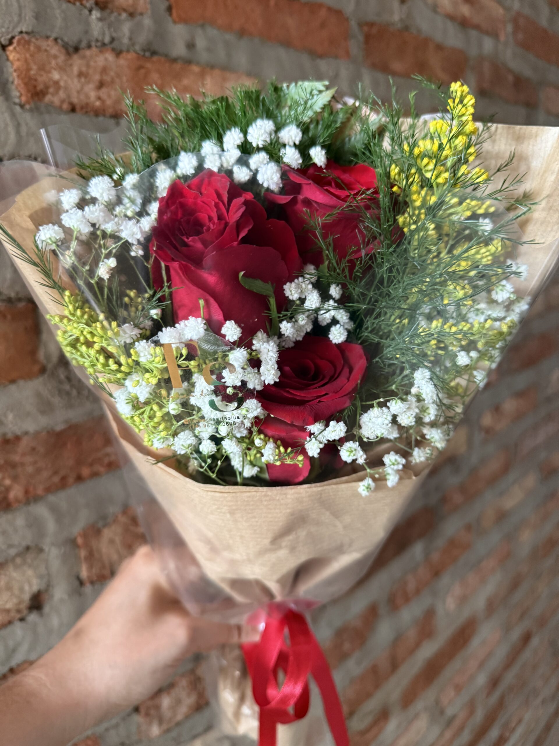 Buquê rústico com 3 rosas vermelhas , folhagens e gipsófila.